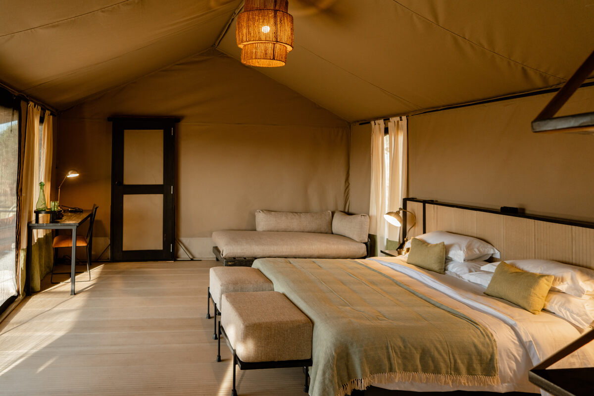 The camp’s five spacious, en-suite tents are designed for comfort and immersion, with raised platforms that enhance your connection to the surrounding plains.