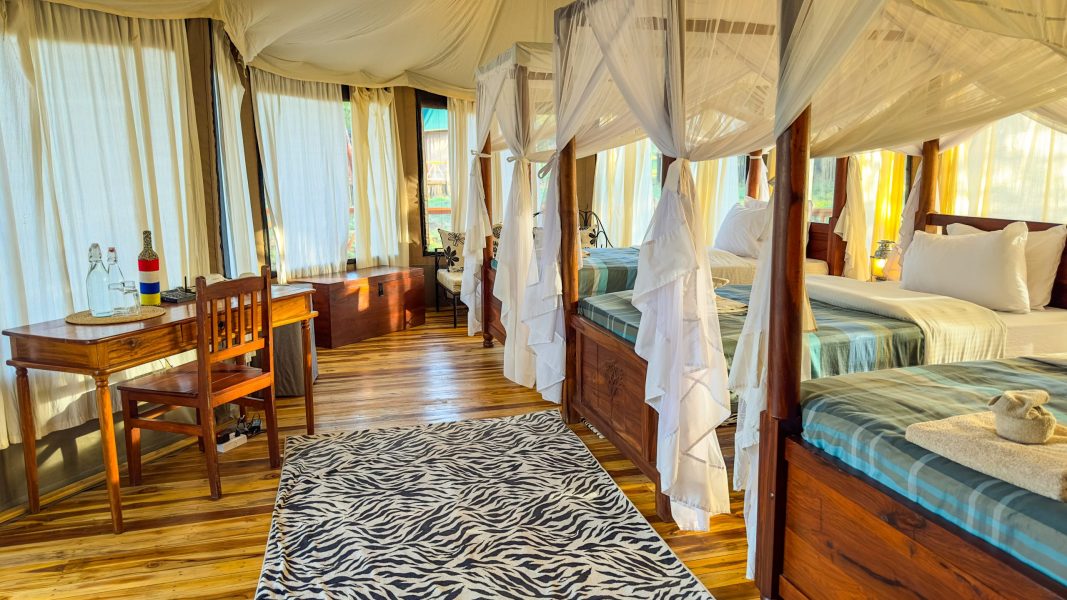 • Inside, you’ll find a king or queen bed with mosquito netting, an en-suite bathroom with a flushing toilet and hot shower, solar lighting, and a private veranda.