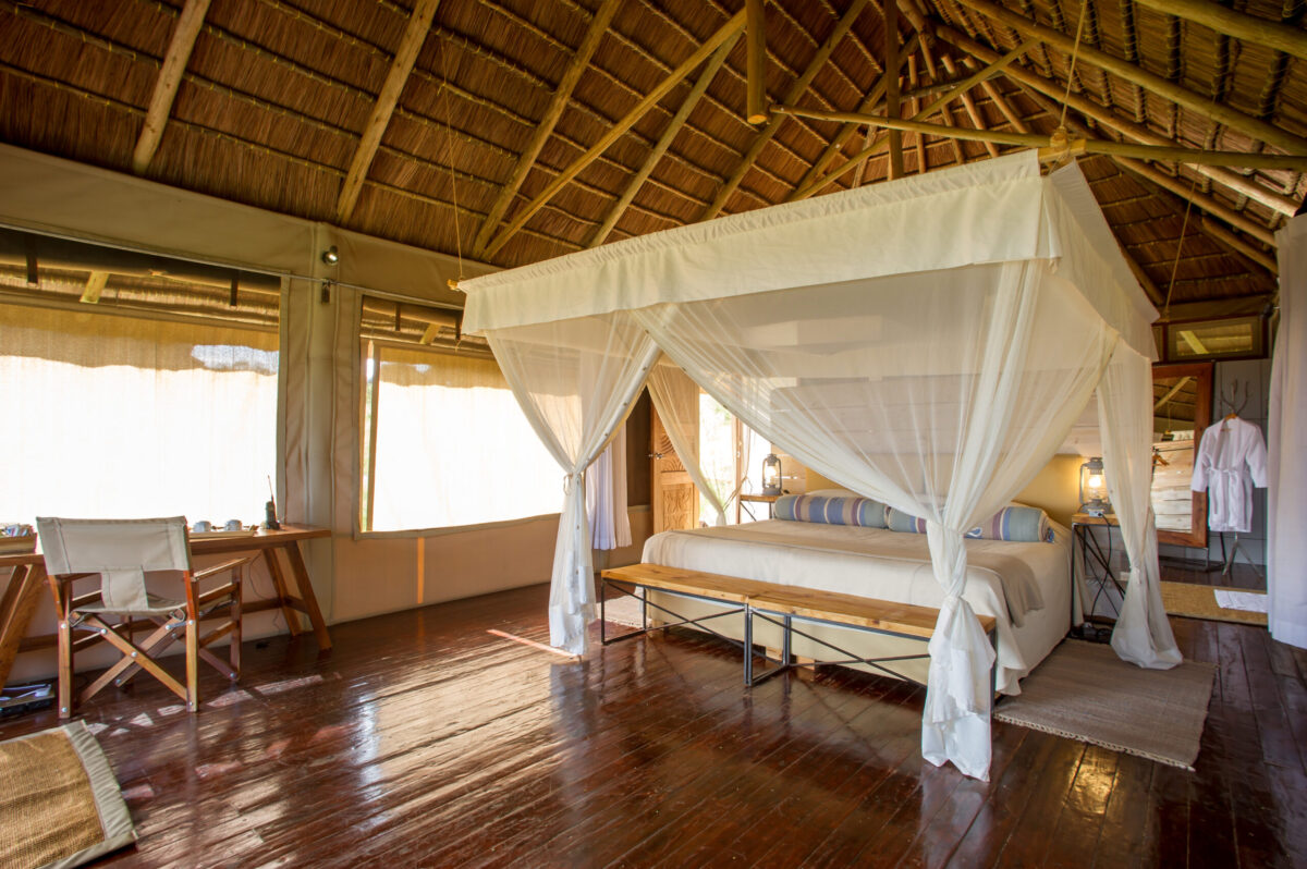 Blended Design: The camp’s modern African aesthetic uses soft, bright fabrics and natural materials, creating a serene and stylish sanctuary after a day of exploration.