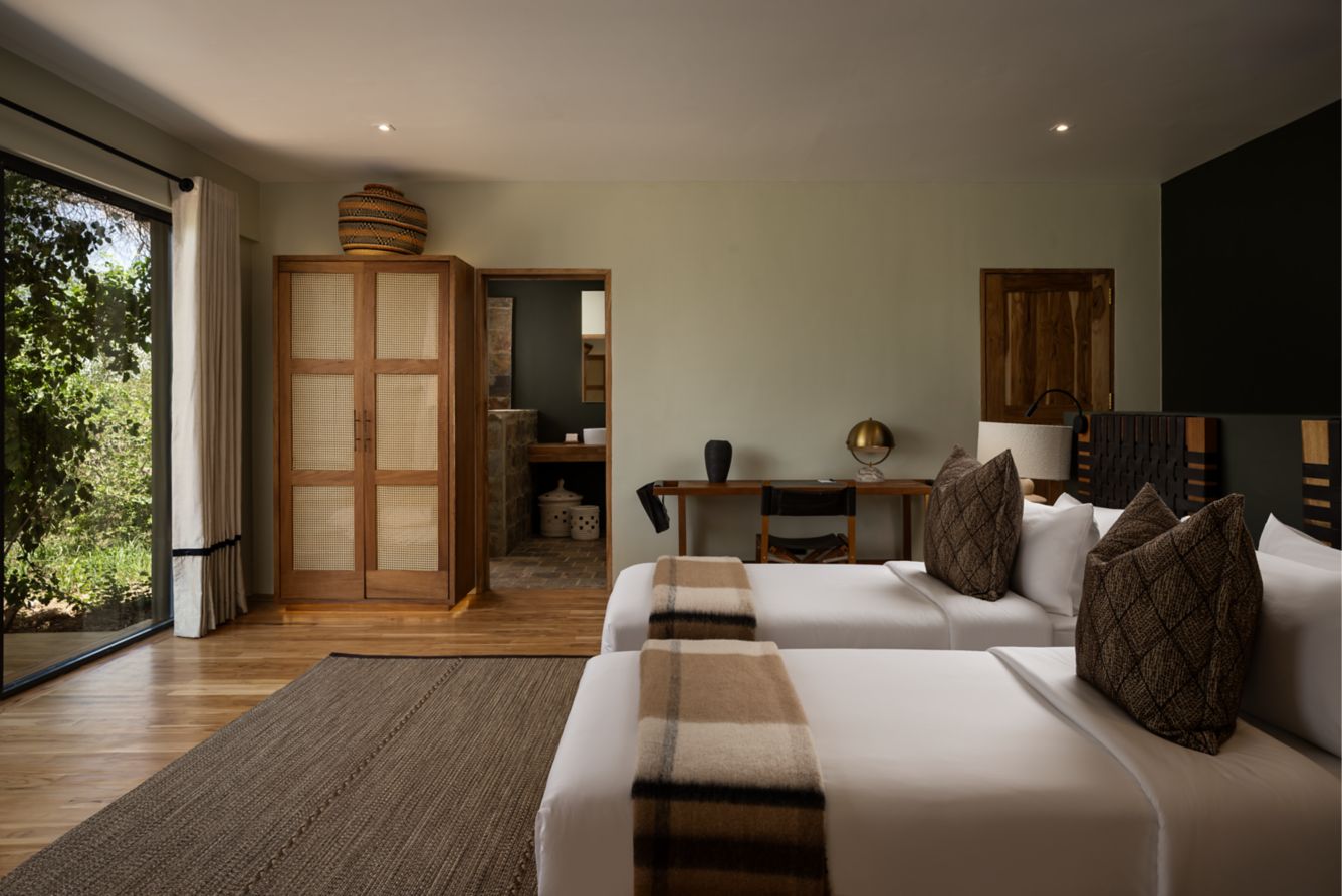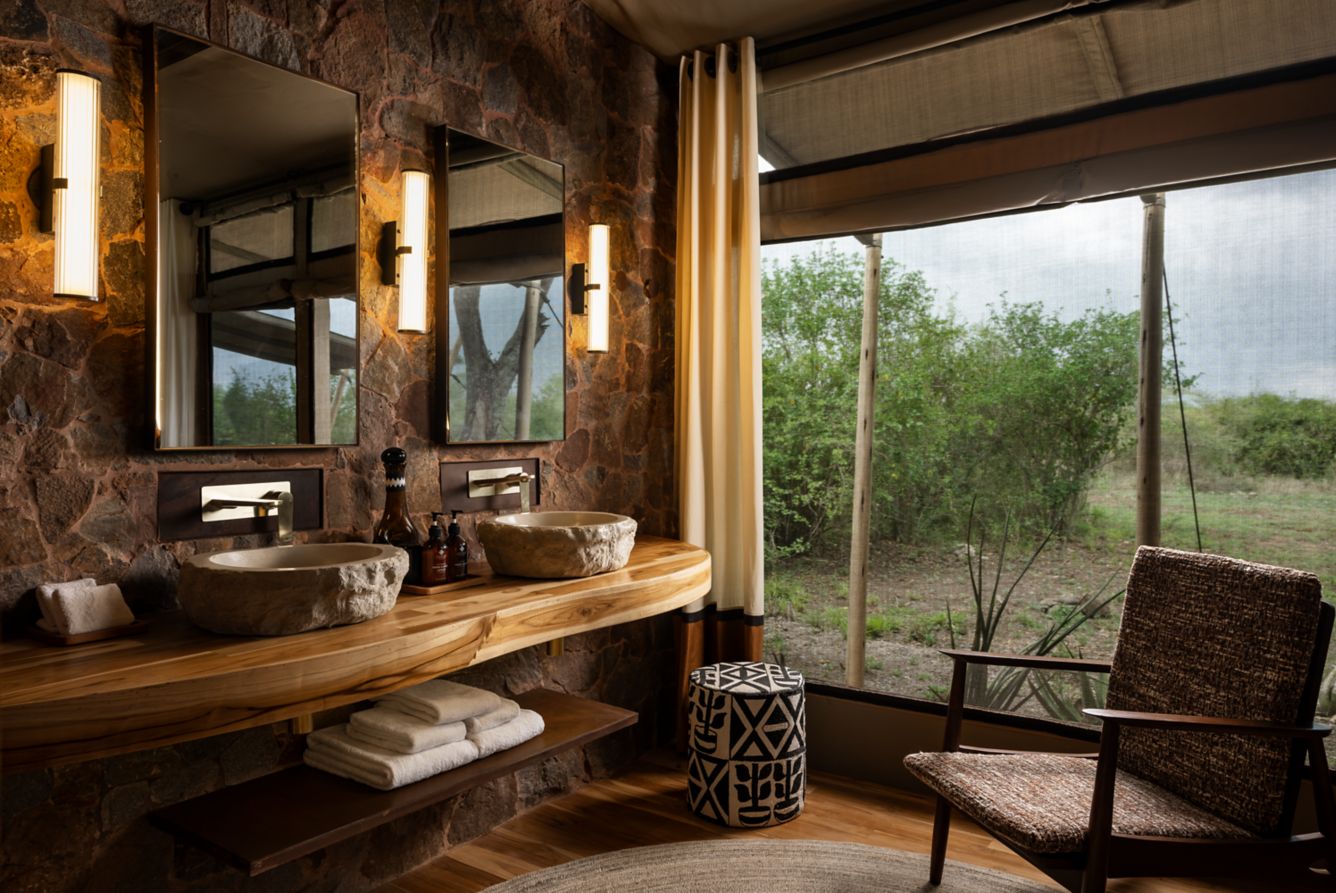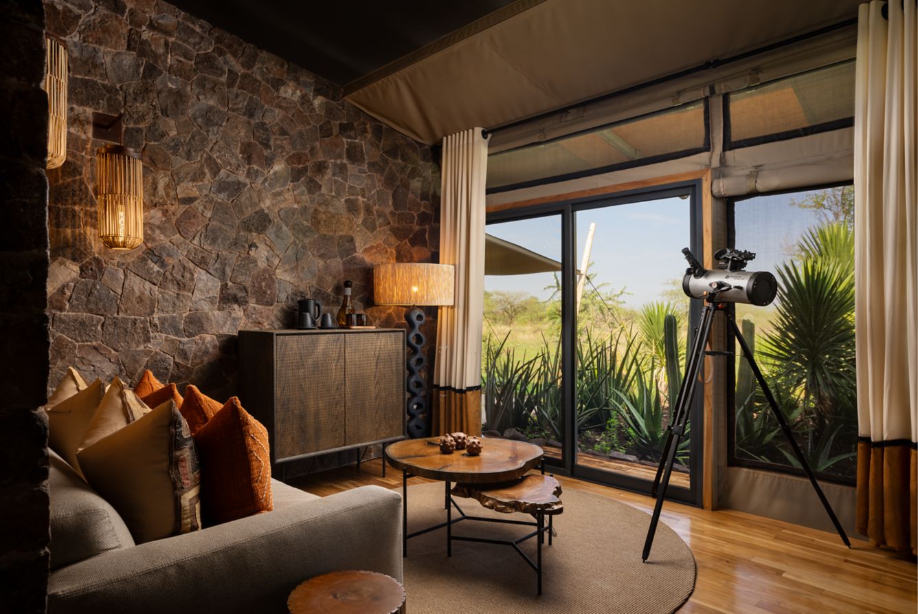 13 Spacious Safari Tents designed for comfort, each featuring comfortable beds with fine linen, mosquito nets, and a private veranda with chairs overlooking the Serengeti plains.